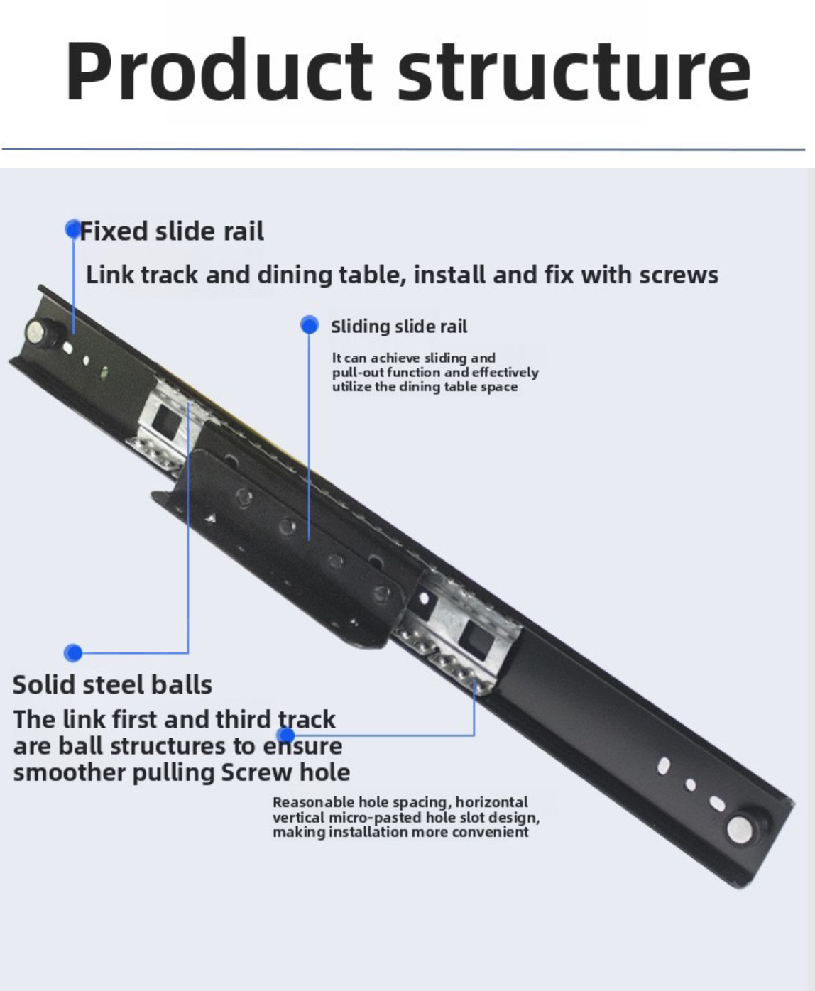 8--Double-row solid steel balls-smooth pulling, strong balance, silent closing.